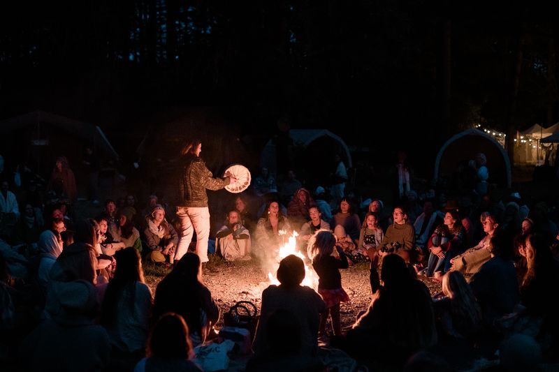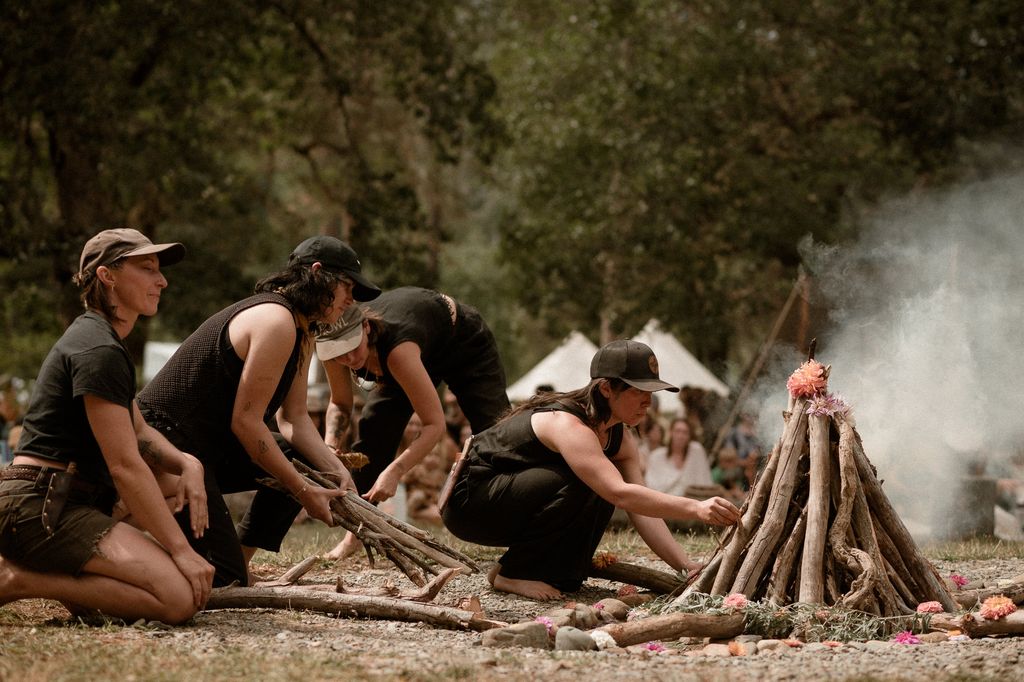 The Hearth Fire is the beating heart center of the Spirit Weavers Village. To mark the beginning of each session, our Fire Tenders light a fire by hand, calling upon the solar energy stored in our tree ancestors to birth a little Sun here on Earth. They tend to this being for the duration of our time gathered together: one sustained flame for us to spiral out from every morning and back into every evening. We share our stories through song, dance and conversation around its warmth at night, and utilize its alchemical properties throughout the day for classes. Fire, when conjured and tended in an intentional and caring way, is a portal to the spirit realm, a transmuter of energy, and a focal point for ceremony and communion. This is a deep reciprocal relationship that is intrinsic to being human. Although we often forget our direct dependence on this element, it is essential to our existence and spending time around a sacred fire helps us to remember our innate age-old connection.